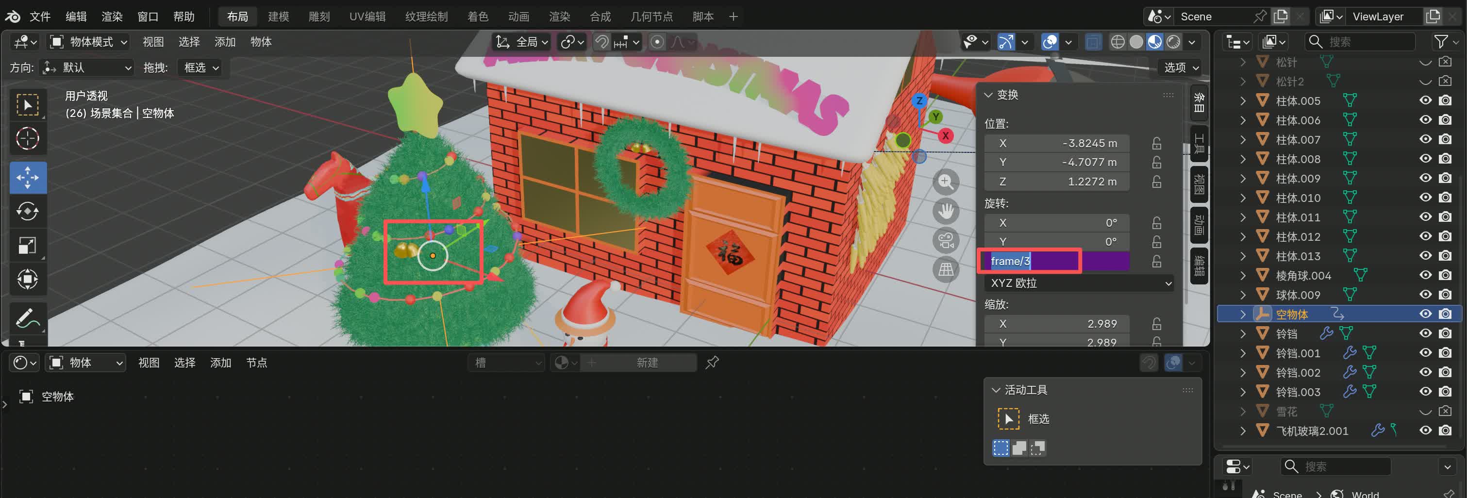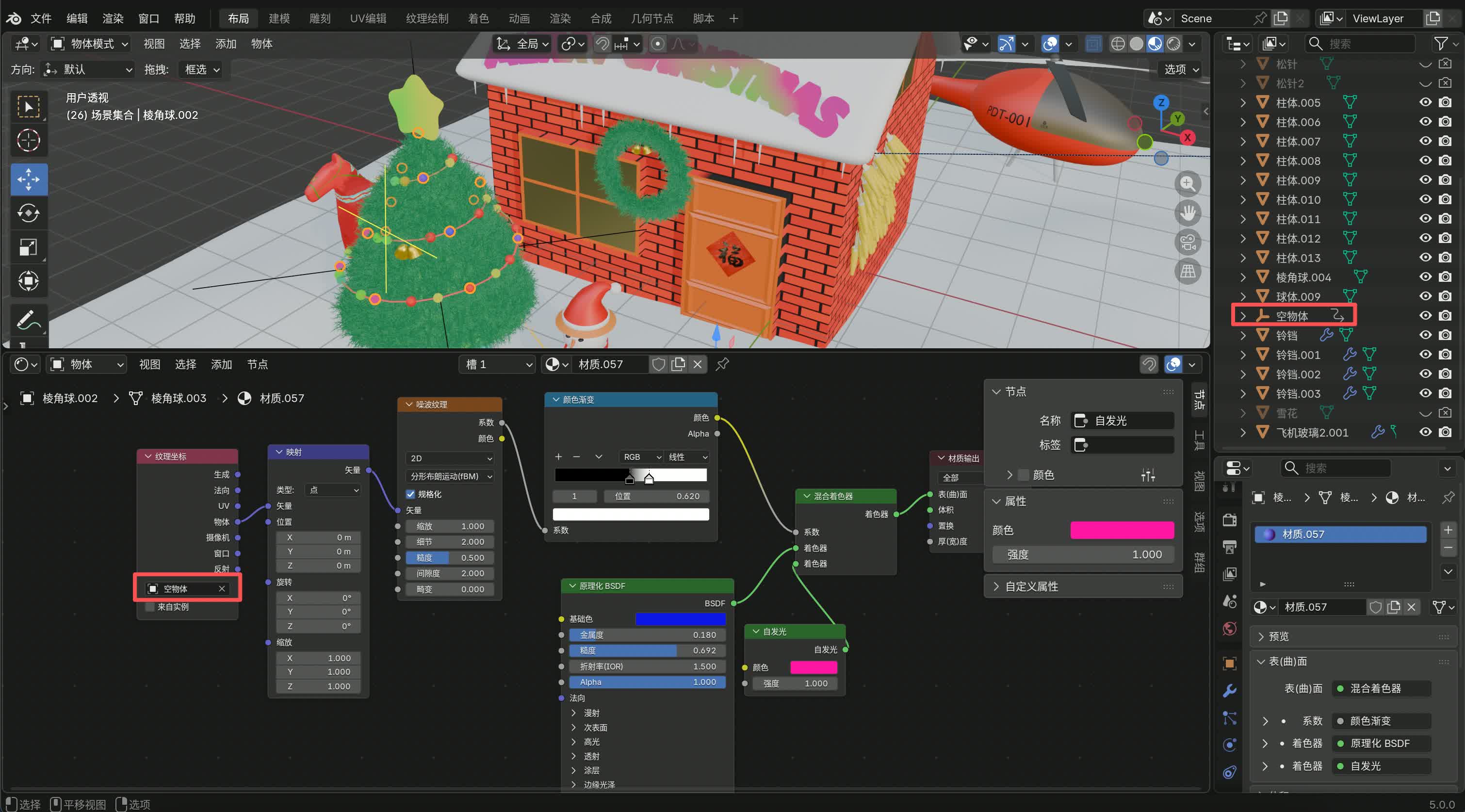 Blender制作圣诞闪烁彩灯# 步骤# 使用空物体的旋转产生矢量数据,控制噪波纹理系数和渐变系数,从而控制混合着色器系数,从而得到变化的颜色输出 空物体的旋转值设为公式#frame/N,根据帧控制旋转 效果#